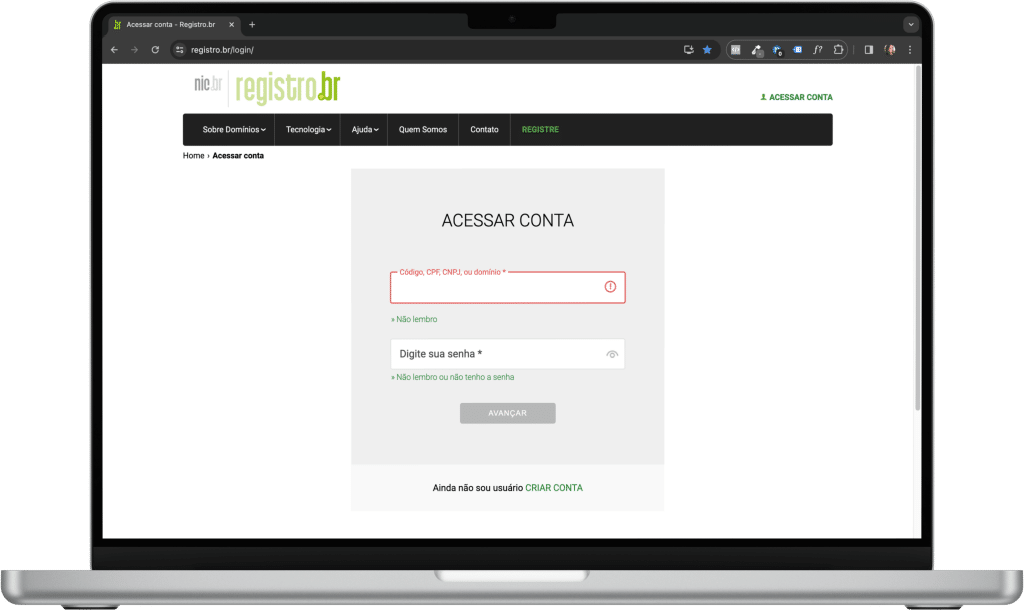 Acesse a página de Login no registro.br e insira suas credenciais. Caso, você não saiba ou lembre suas credenciais, procure quais são as credenciais e/ou quem é o responsável pelo domínio na página Whois e tente restaurar a senha seguindo as orientações do Registro.br